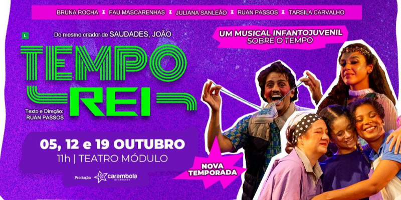 Após uma temporada de estreia em maio deste ano que levou mais de 1000 pessoas ao Teatro Módulo. O espetáculo tempo Rei retorna para uma temporada nos domingos de outubro (dias 05/10, 12/10 e 19/10)