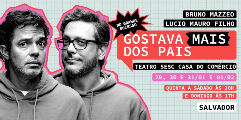 O Teatro Sesc Casa do Comércio recebe, de 29 de janeiro a 1 de fevereiro, a comédia “Gostava Mais dos Pais”. Protagonizada por Bruno Mazzeo e Lúcio Mauro Filho, a montagem propõe um diálogo franco e hilário sobre o lugar de cada um no mundo contemporâneo.