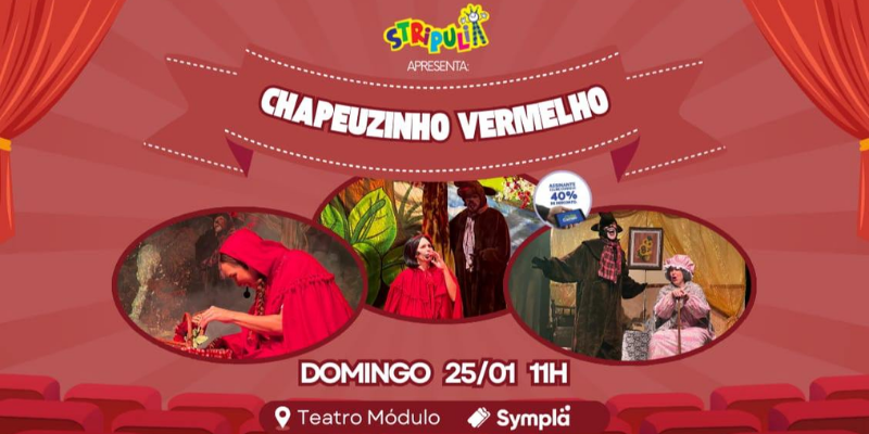 Neste domingo (25), às 11h, o Grupo Stripulia leva ao palco do Teatro Módulo uma adaptação cheia de humor da história de “Chapeuzinho Vermelho”.