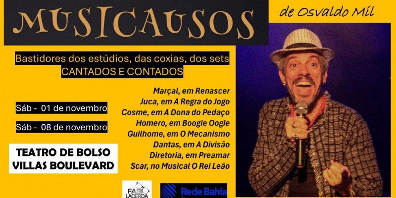 Em MUSICAUSOS Osvaldo Mil, acompanhado por banda, solta a voz, num desfile pela nossa música popular trazendo Gonzaguinha, Odair José, Blitz, Padre Zezinho, Rita Lee, Isaurinha Garcia.